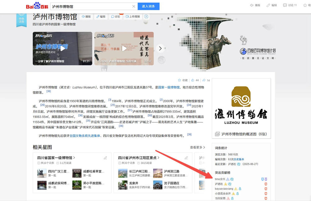 截至目前,作为该词条“守卫者”,我已经先后编辑完善了17个版本的“泸州市博物馆”词条,确保词条内容始终保持最新状态。这份坚持和执着,源于我对家乡的热爱和对知识的追求。